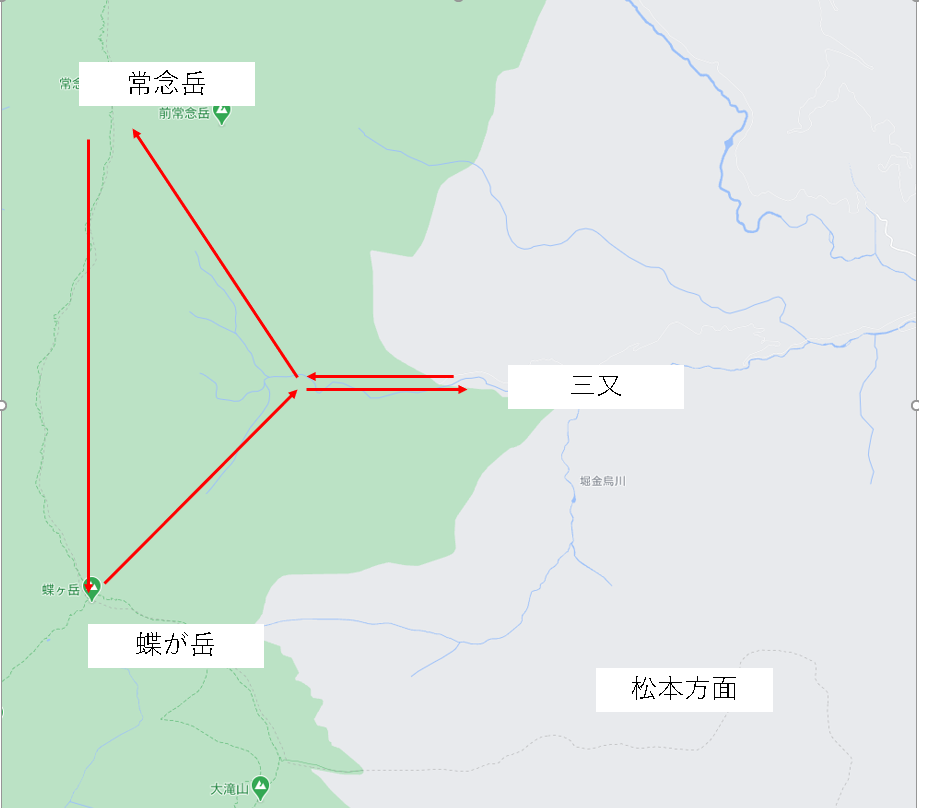 中房温泉から燕岳を目指し一泊、二日目に大天井岳を通って常念小屋に向かい、三日目に常念岳に登頂して一ノ沢から帰るルートです。
